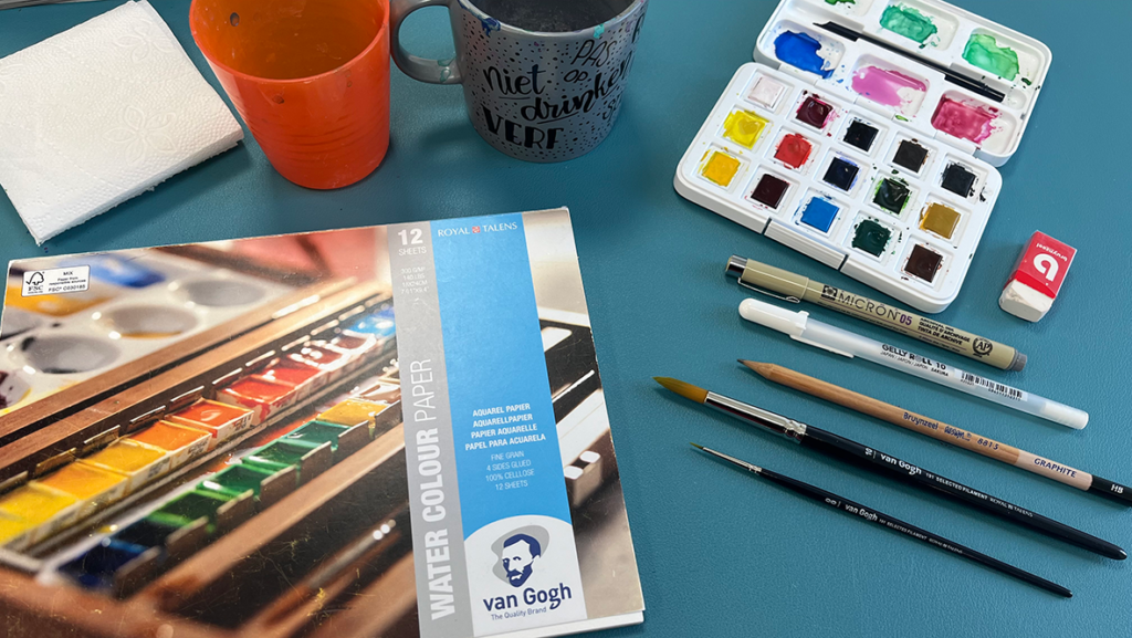 Dit zijn aanbevolen materialen voor de aquarel cursus, maar je kunt de cursus natuurlijk ook met andere aquarelmaterialen volgen.