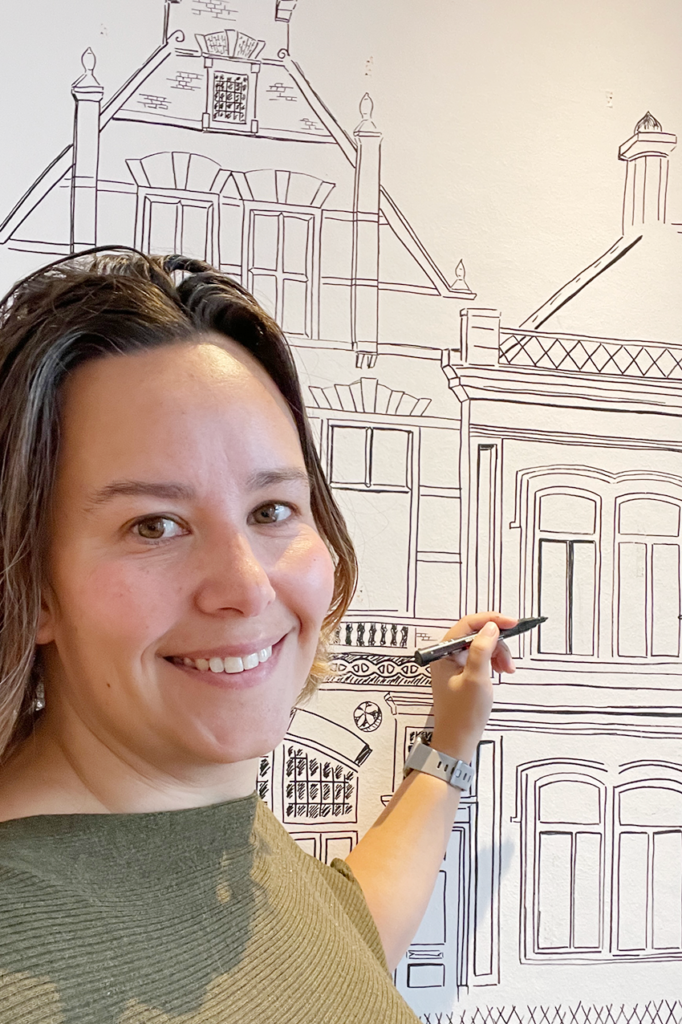 De eerste stap is het gezamenlijk sparren over het ontwerp tijdens een kennismakingsgesprek of briefing. Dit doe ik het liefste bij jullie op locatie, zodat ik kan zien waar de tekening moet komen en hoe de ruimte eruit. We bespreken je wensen en hoe je dit graag vormgegeven ziet. Ook maak ik wat foto’s die ik later kan gebruiken bij het ontwerp en het voorstel van het ontwerp.
